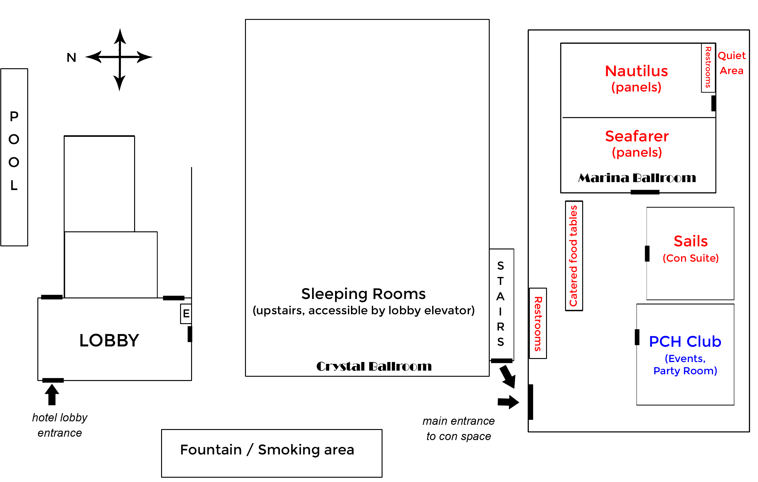 We will utilize con spaces in 2026 the same as in 2025. The Marina Ballroom is our space for panels and some events. The Sails is our Con Suite for socializing during the daytime. The Quiet Area is in the back hall beside the Nautilus room. The PCH Club is our primary eating space for anyone who wants to use it, as well as the group's "party room." Food will be set out in the hallway and you will have the option to eat in the restaurant or take it to your room if you prefer. We will also have events like Club Femslash in the restaurant to provide for better ventilation.